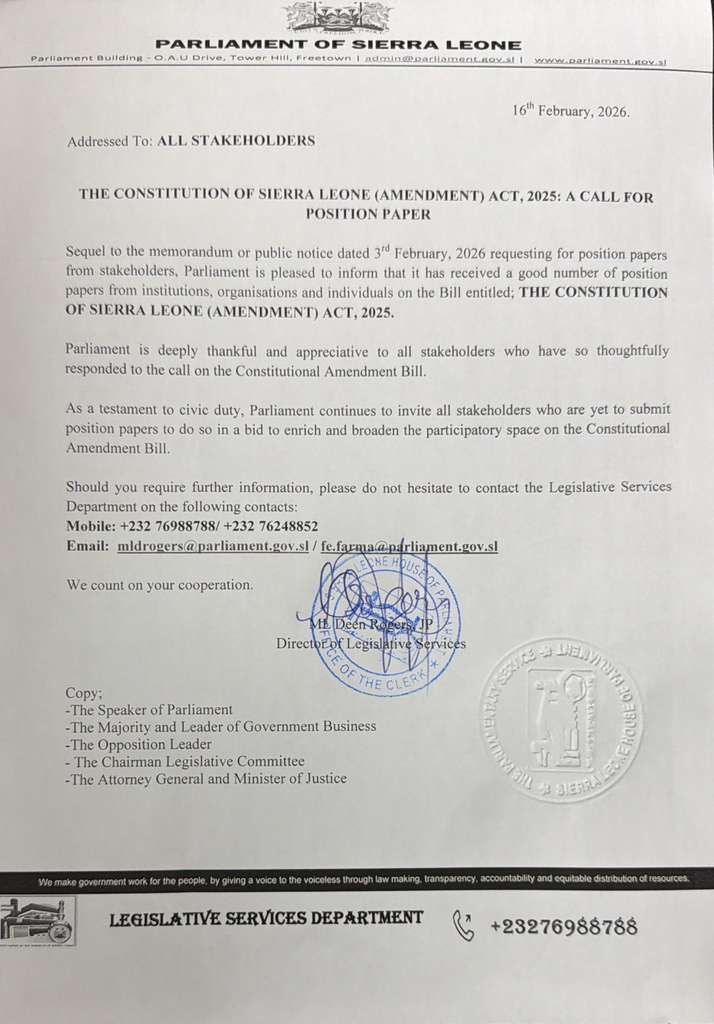 We are calling on groups and/or individuals to submit position papers to Parliament on the Constitution of Sierra Leone Amendment Bill. This is an open process and we want this to be owned by the people of Sierra Leone. Broad perspectives will enrich the outcome of this process. Let’s do this together.